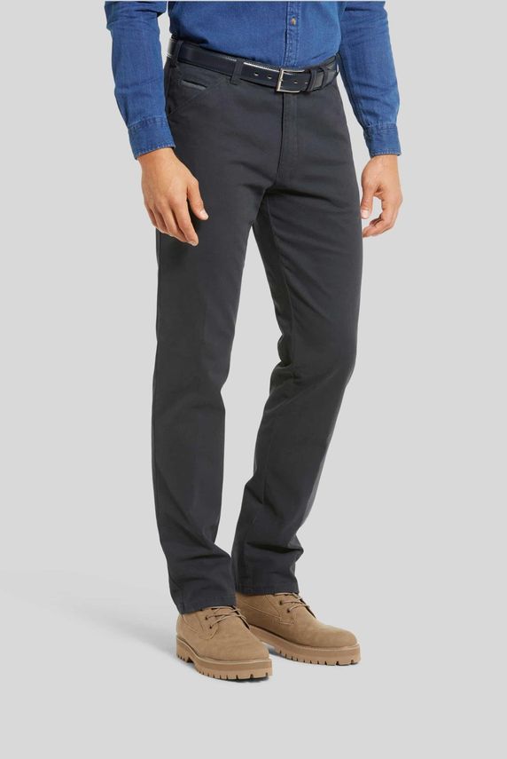 . Den afslappede Casual Style har diagonale sidelommer, en ekstra møntlomme og to baglommer med knapper. De er forsynet med et farvekoordineret mønster. Det tofarvede mikrodesign har en letvægtsstruktur og giver et særligt look. Økologisk bomuld er ikke kun